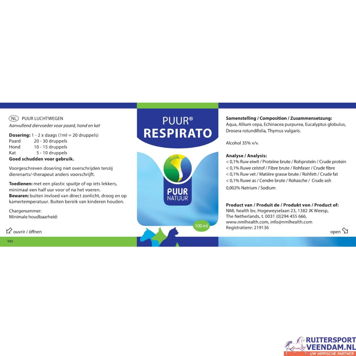 PUUR Respirato is een natuurlijk supplement dat speciaal is ontwikkeld ter ondersteuning van de luchtwegen bij dieren. Het bevordert een vrije ademhaling en helpt bij het verzachten van geprikkelde luchtwegen, bijvoorbeeld bij hoestklachten of irritatie door stof, kou of pollen.