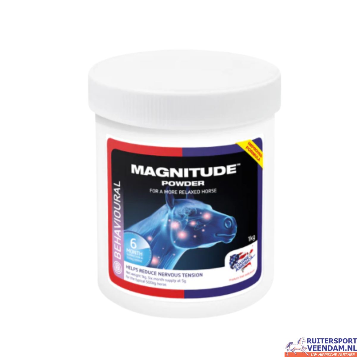 Magnitude is een hoogwaardig magnesiumsupplement dat helpt om spanning te verminderen en de concentratie en focus van je paard te verbeteren. Het ondersteunt een gezond zenuwstelsel en is ideaal voor paarden die gevoelig zijn voor stress, spanning of prikkels uit de omgeving.