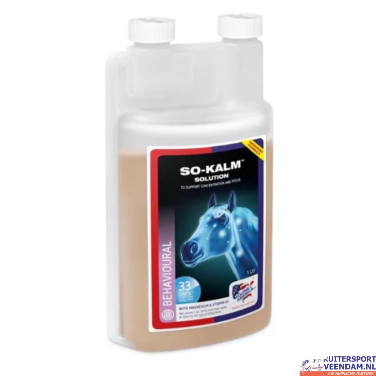 So Kalm Solution is een smakelijke vloeibare formule die essentiële micronutriënten levert ter ondersteuning van een gezond zenuwstelsel. Het helpt paarden en pony’s om kalm te blijven en zich beter te concentreren op hun werk, vooral in nieuwe of stressvolle situaties zoals training, wedstrijden of onbekende omgevingen.