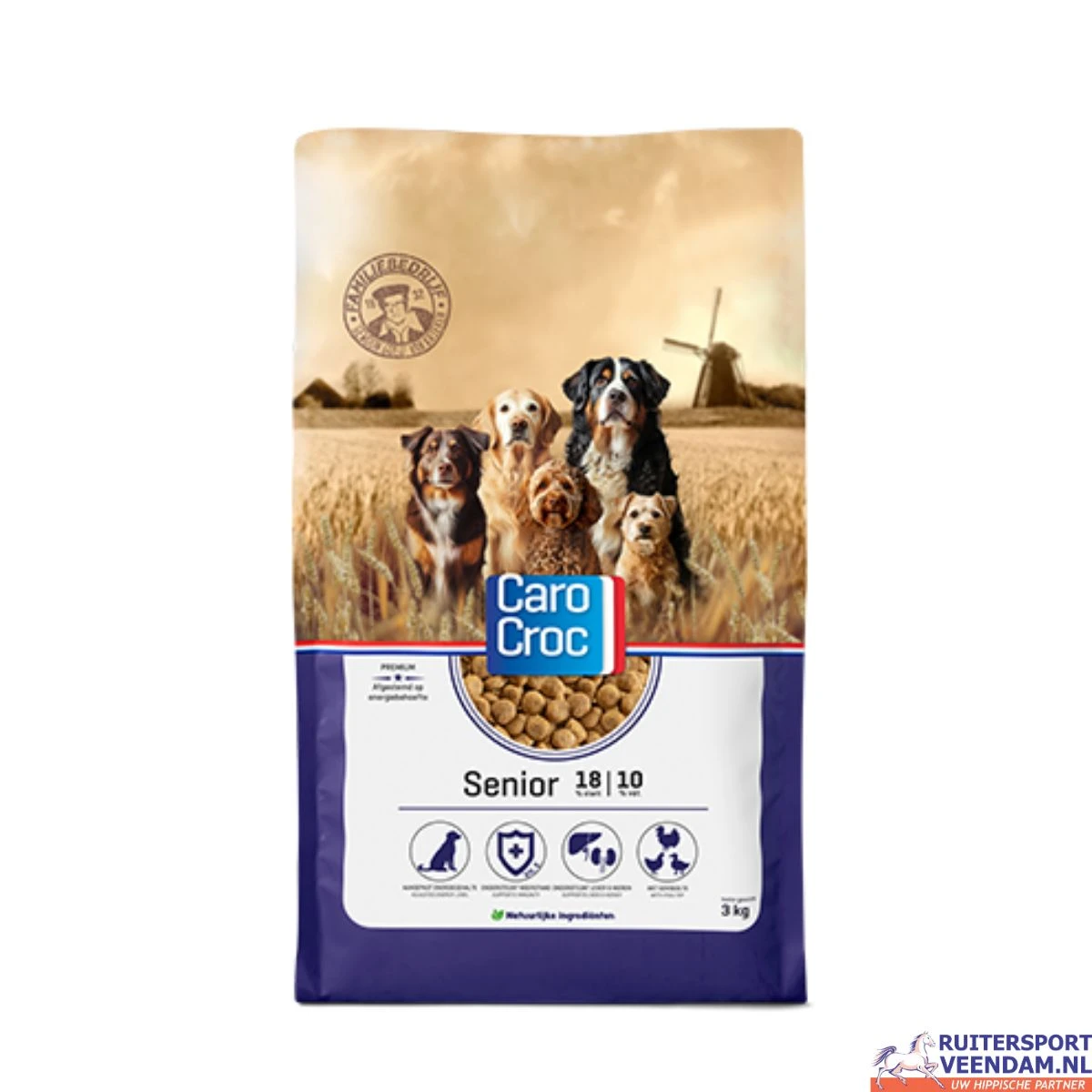Vanaf 7 jaar kan jouw hond verouderingsverschijnselen vertonen. De stofwisseling gaat trager werken en het activiteitsniveau kan afnemen. Dit betekent dat de energiebehoefte van jouw hond verandert. Het is erg belangrijk om het voer hier op aan te passen, om de gezondheid te ondersteunen. Zo heeft CaroCroc Senior een laag eiwit- en vetgehalte (18% eiwit, 10% vet) in vergelijking met een gemiddeld volwassen voer (23% eiwit, 12% vet). Dit noemen we ook wel voeren naar energiebehoefte.