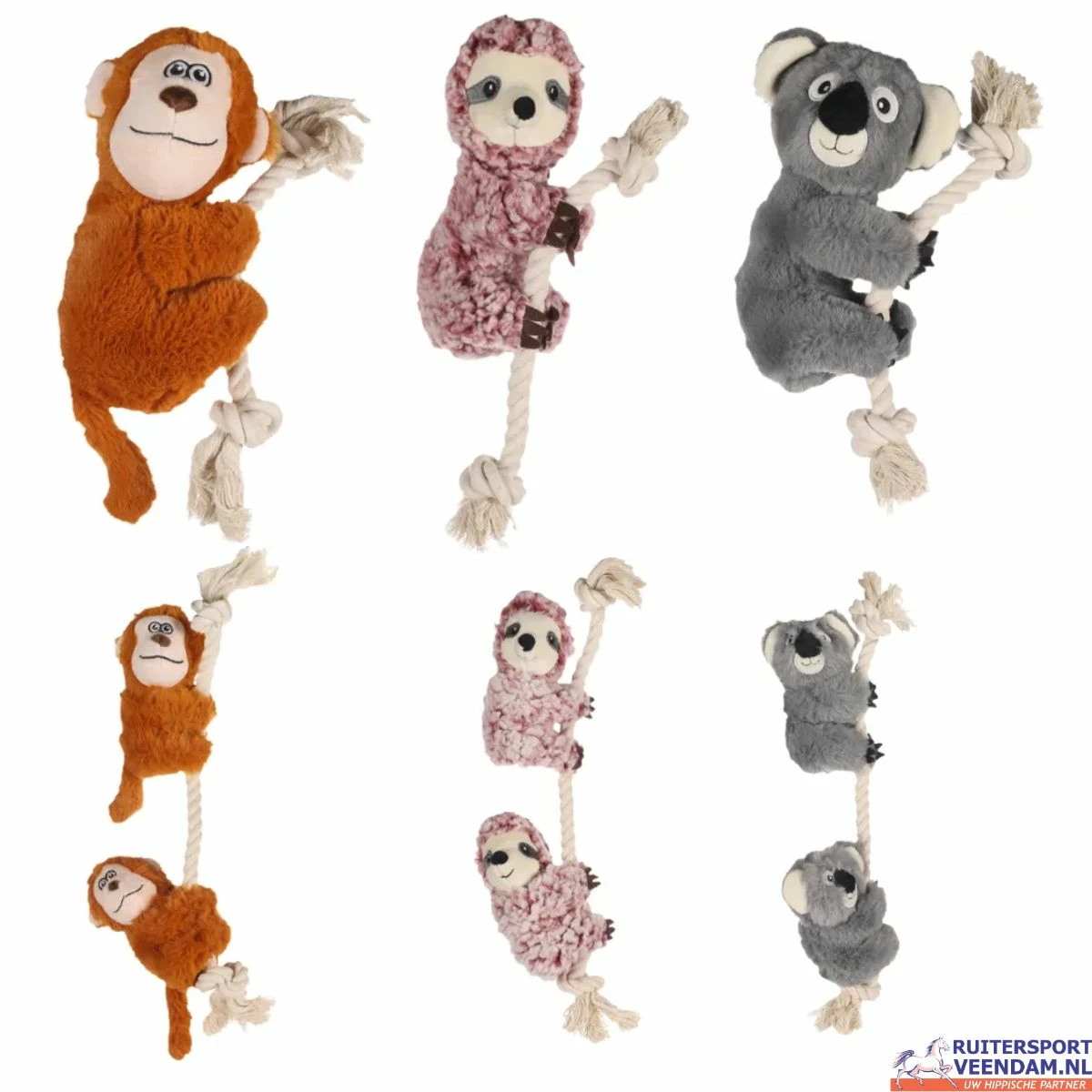 Dit hondenspeelgoed is en combinatie van een flostouw met een aap, koala of luipaard van pluche materiaal.