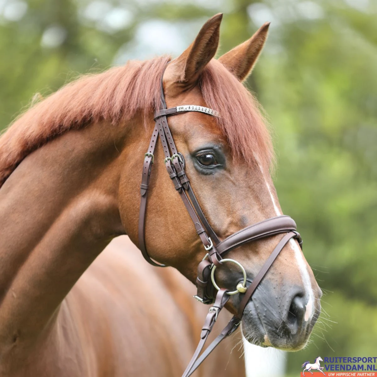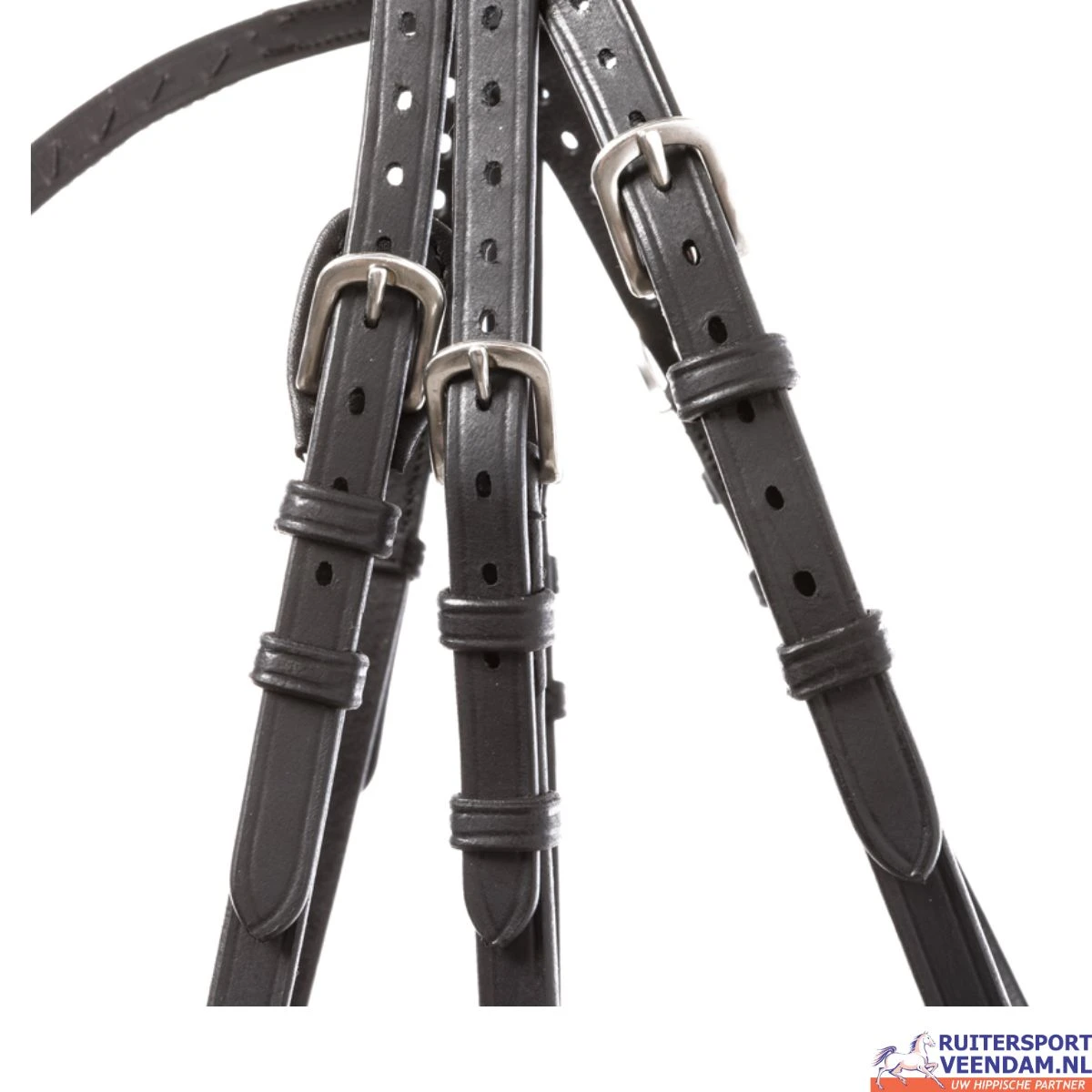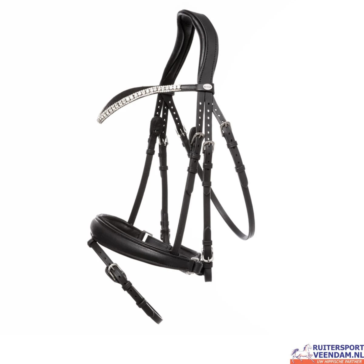 De frontriem schittert met grote en kleine witte strassstenen. Het neusriem is aan beide zijden verstelbaar. Inclusief smalle rubberen teugels met stops (16 mm).