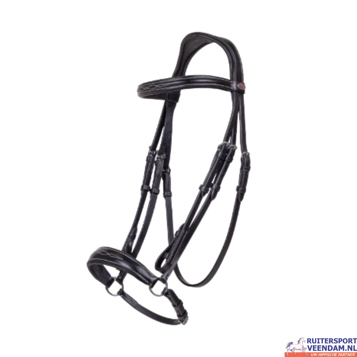 Het anatomisch gevormde kopstuk biedt extra comfort en drukverdeling achter de oren, terwijl de zachte padding op zowel het kopstuk als de neusriem zorgt voor een aangename pasvorm. De witte sierstiksels op de neus- en frontriem geven het hoofdstel een verfijnde, klassieke uitstraling.