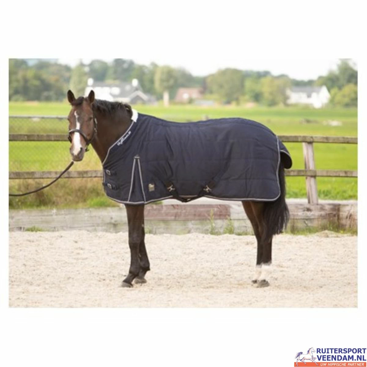 Staldeken model Highliner met comfortabele mininek en een optimale pasvorm. 300D polyester, 200gr vulling en polyester voering. Met loopsplit, staartflap, lage kruissingels met elastieken inzet. 2 voorsluitingen en afneembare elastische bilkoorden.