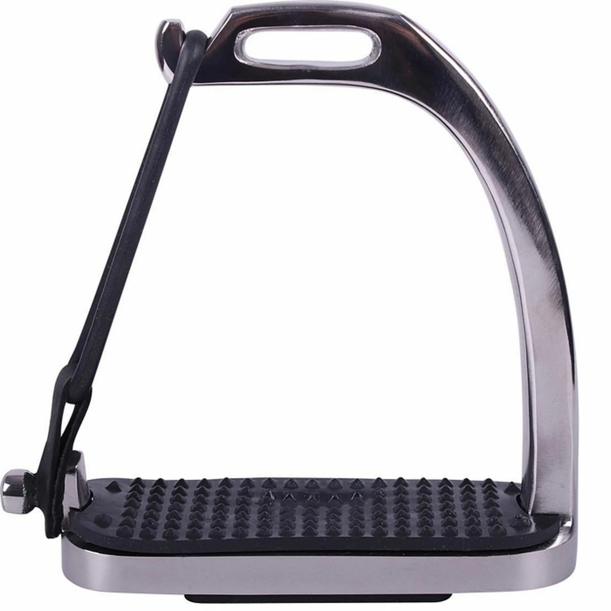 Deze QHP veiligheidsbeugel zorgt ervoor dat de voet van de ruiter niet in de beugel vast blijft zitten tijdens een val. Het elastiek aan de zijkant van de beugel zal door de druk losschieten.