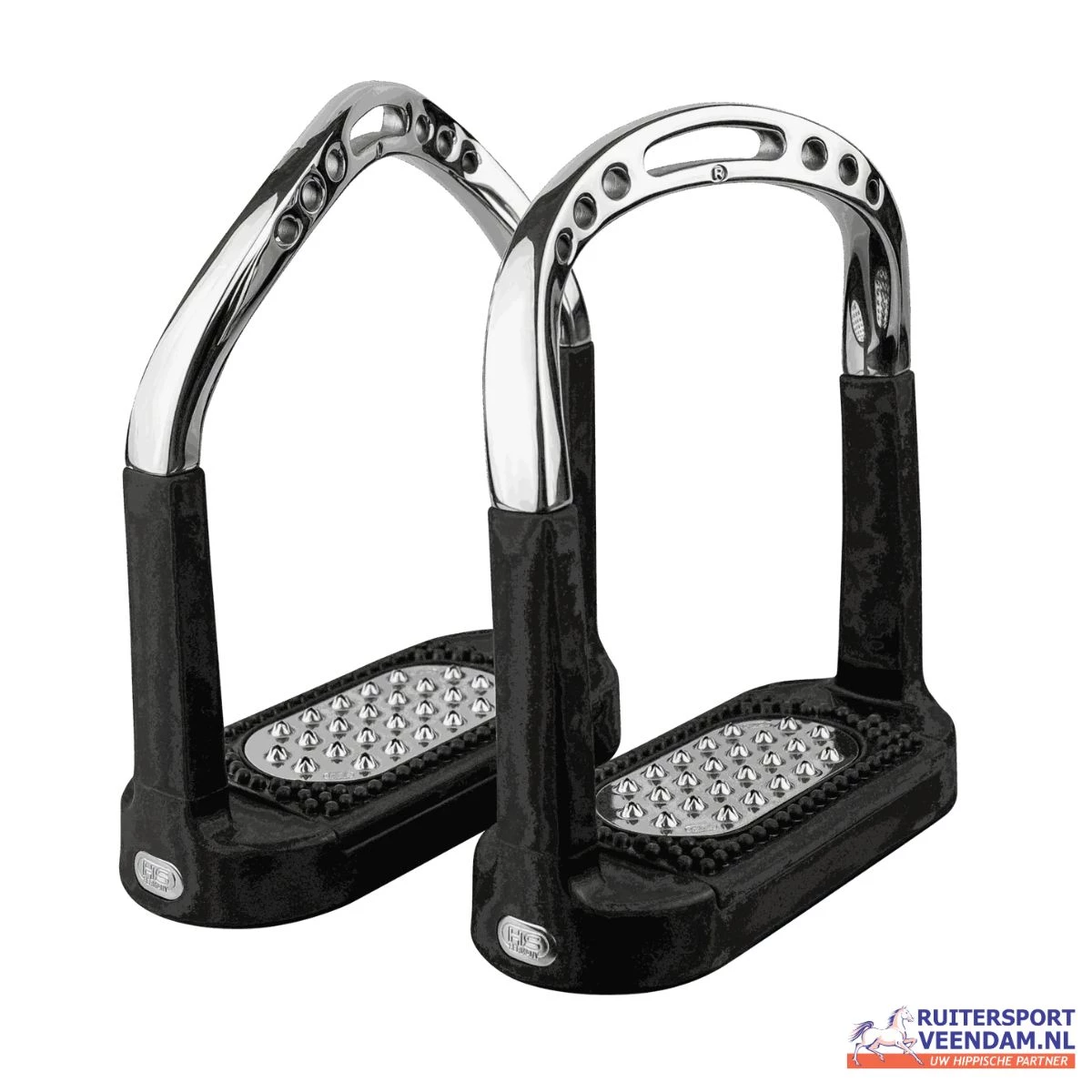 Het moderne design in fijn zilver/zwart maakt de kenmerken van deze stijgbeugel compleet. Hij is gemaakt van hoogwaardig roestvrij staal en gedeeltelijk bedekt met plastic of duurzaam rubber. Voor een correcte bevestiging aan het zadel zijn de stijgbeugels in het bovenste gedeelte gemarkeerd met een “L” voor links en een “R” voor rechts.