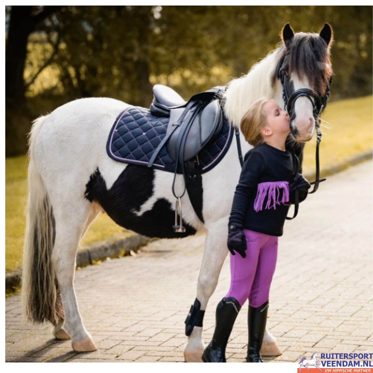 Naast het charmante ontwerp biedt het zadeldek ook optimaal comfort voor je pony. De voering van absorberend mesh zorgt ervoor dat vocht snel wordt afgevoerd, waardoor je pony koel en droog blijft tijdens het rijden. Dankzij de korte D-ring lussen en singellussen met klittenband blijft het zadeldek stevig op zijn plek.