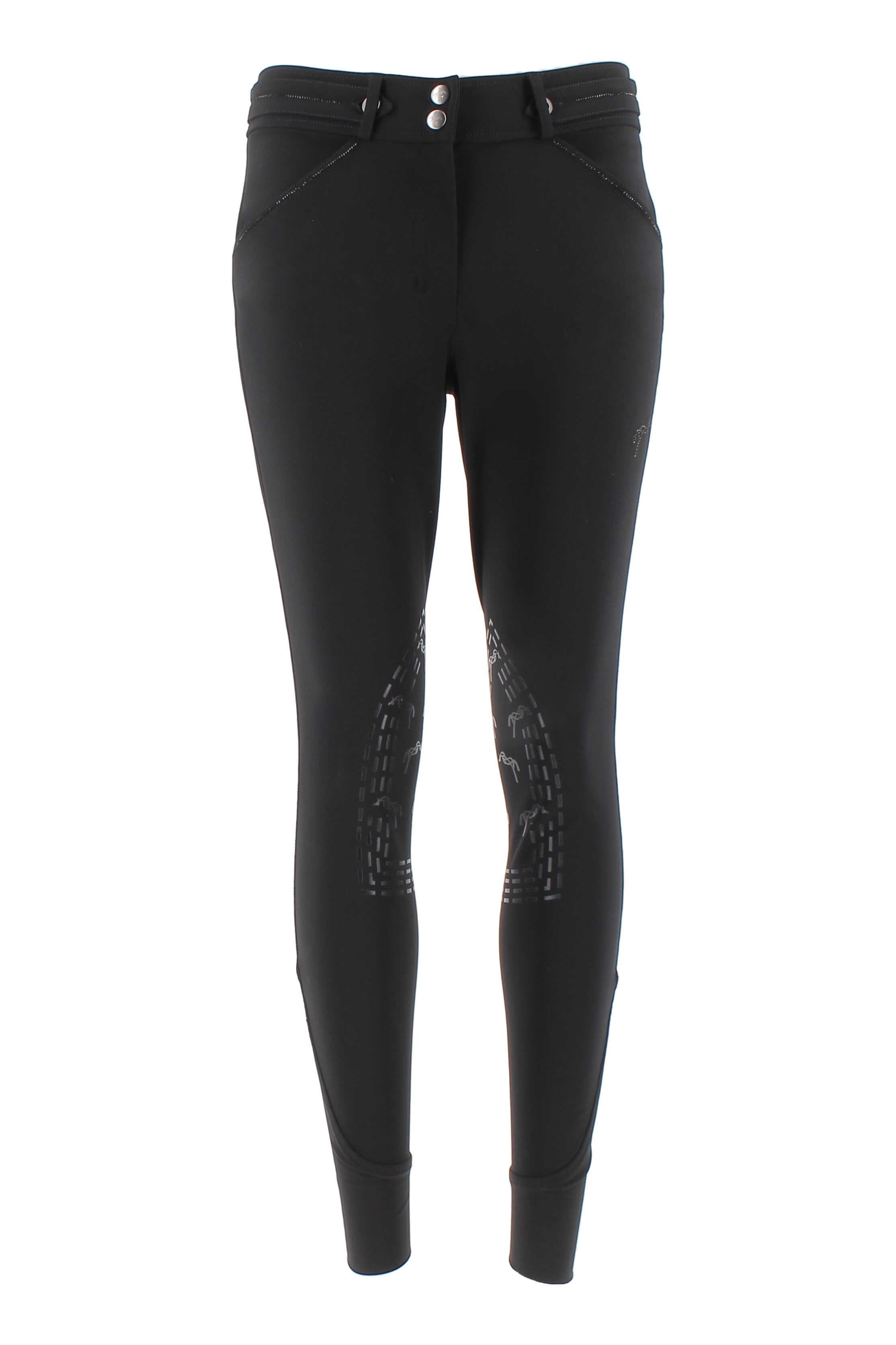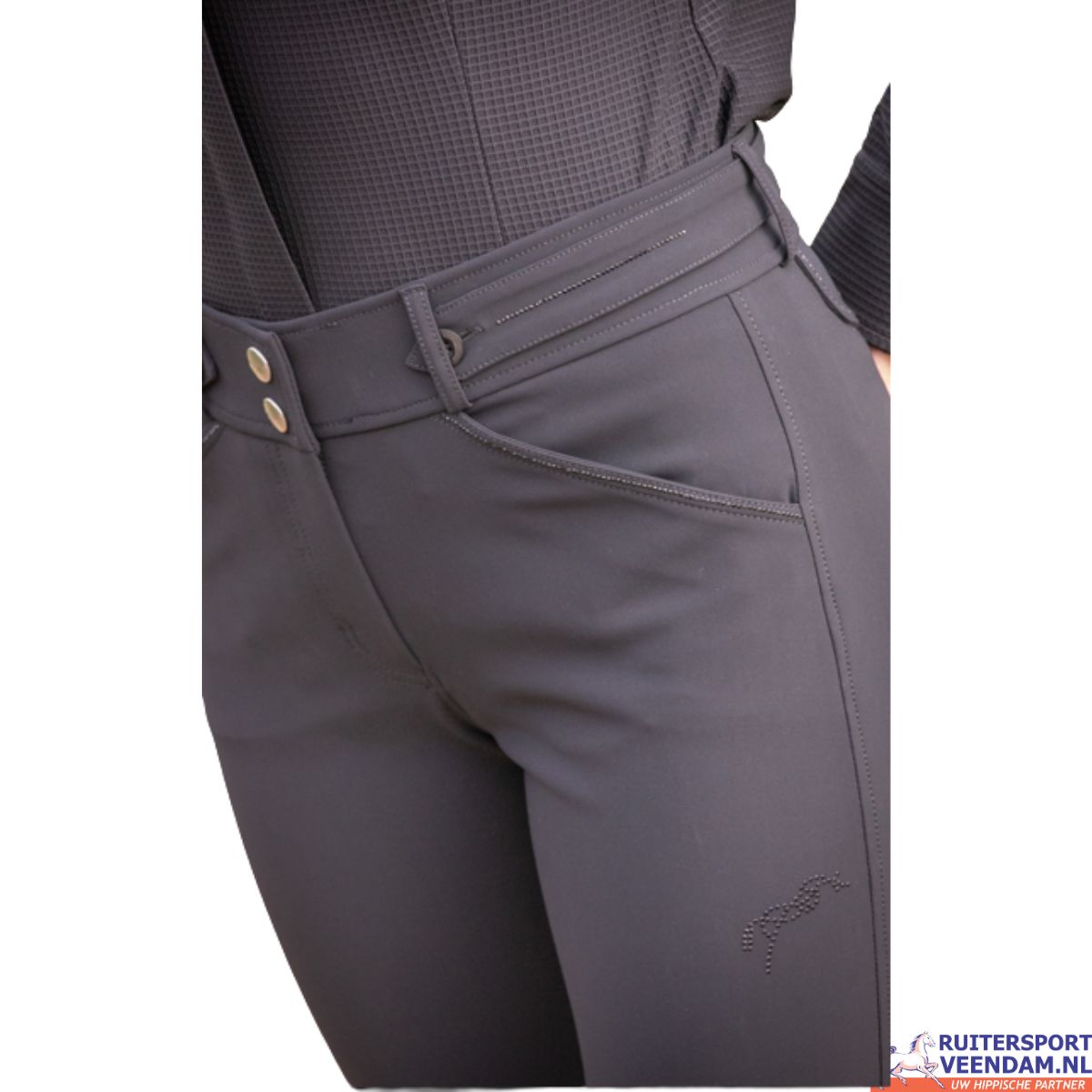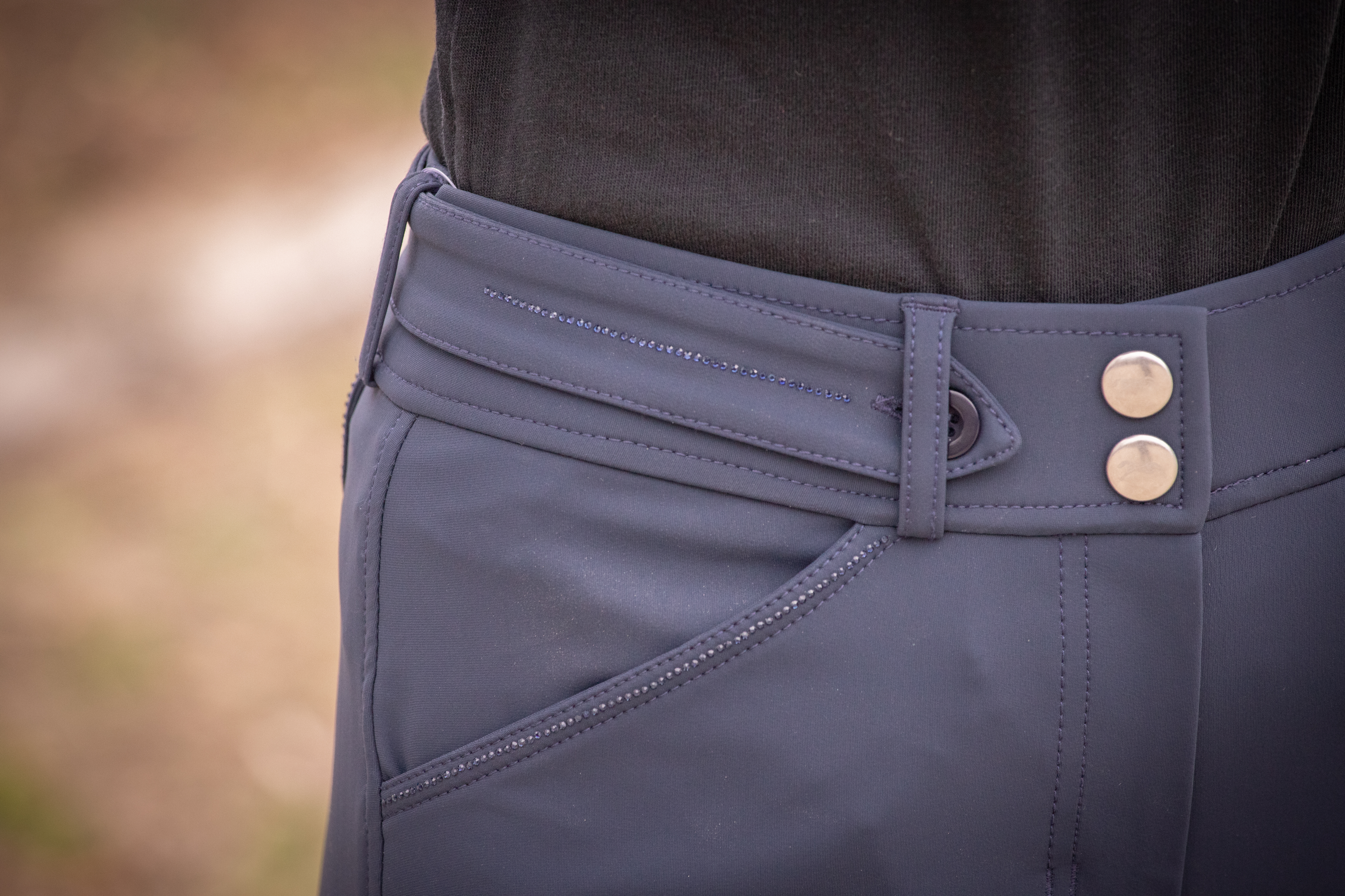 De Elegance Pénélope rijbroek is een perfecte mix van elegantie en functionaliteit. De tailleband en de voor- en achterzakken zijn subtiel versierd met een rij strass-steentjes, wat zorgt voor een verfijnde uitstraling. Op het linkerbeen prijkt een klein Pénélope-paardje, eveneens in strass, als charmant detail.