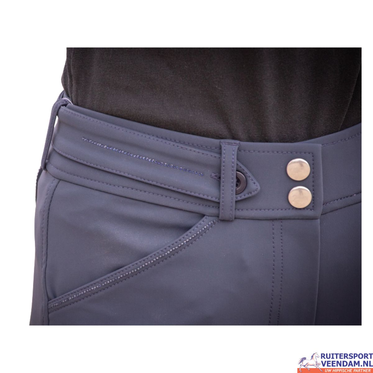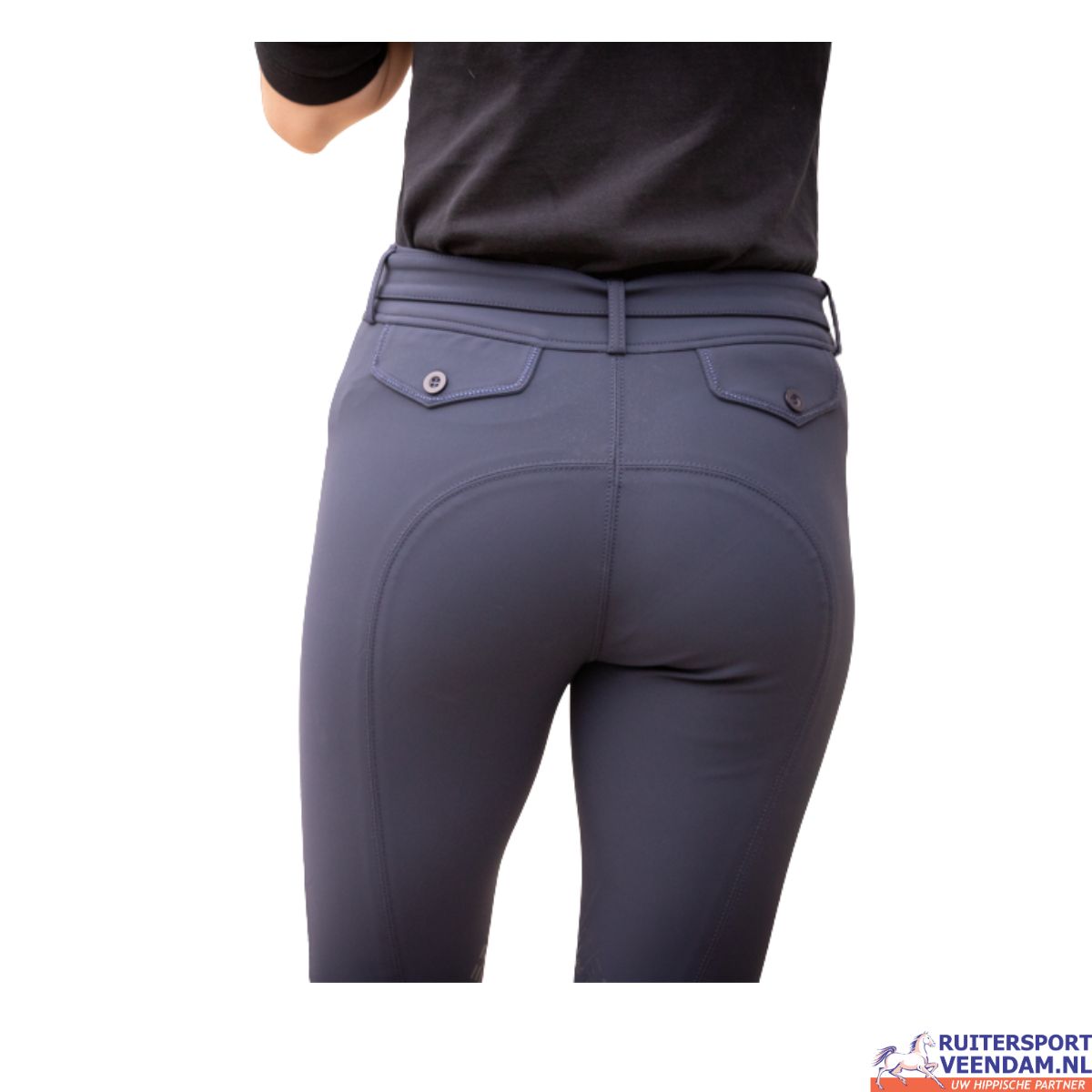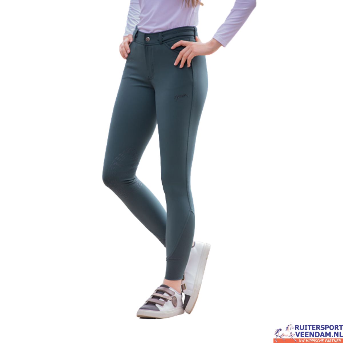 De Elegance Pénélope rijbroek is een perfecte mix van elegantie en functionaliteit. De tailleband en de voor- en achterzakken zijn subtiel versierd met een rij strass-steentjes, wat zorgt voor een verfijnde uitstraling. Op het linkerbeen prijkt een klein Pénélope-paardje, eveneens in strass, als charmant detail.