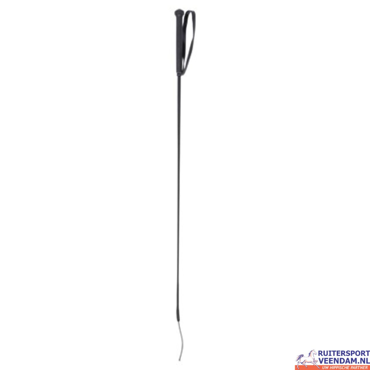 Deze zwarte dressuurzweep is een praktische en betrouwbare keuze voor dagelijks gebruik. De zweep is voorzien van een comfortabel rubber handvat met polslus, waardoor hij stevig en veilig in de hand ligt. De nylon gevlochten steel en het 10 cm lange slagdeel zorgen voor een duurzame en flexibele afwerking. De totale lengte wordt gemeten exclusief het slagdeel. Verkrijgbaar in 80 en 90 cm.