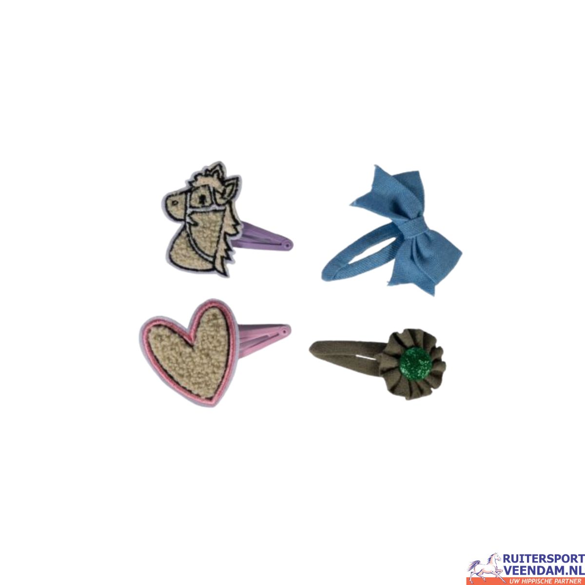 Deze set van 4 haarclips is een echte blikvanger voor jonge ruiterfans. Eén clip is uitgevoerd als Hobby Horse barrette en vormt het hoogtepunt van de set. De overige clips zijn voorzien van zachte teddy fur details, waardoor ze niet alleen stijlvol maar ook speels en comfortabel zijn.