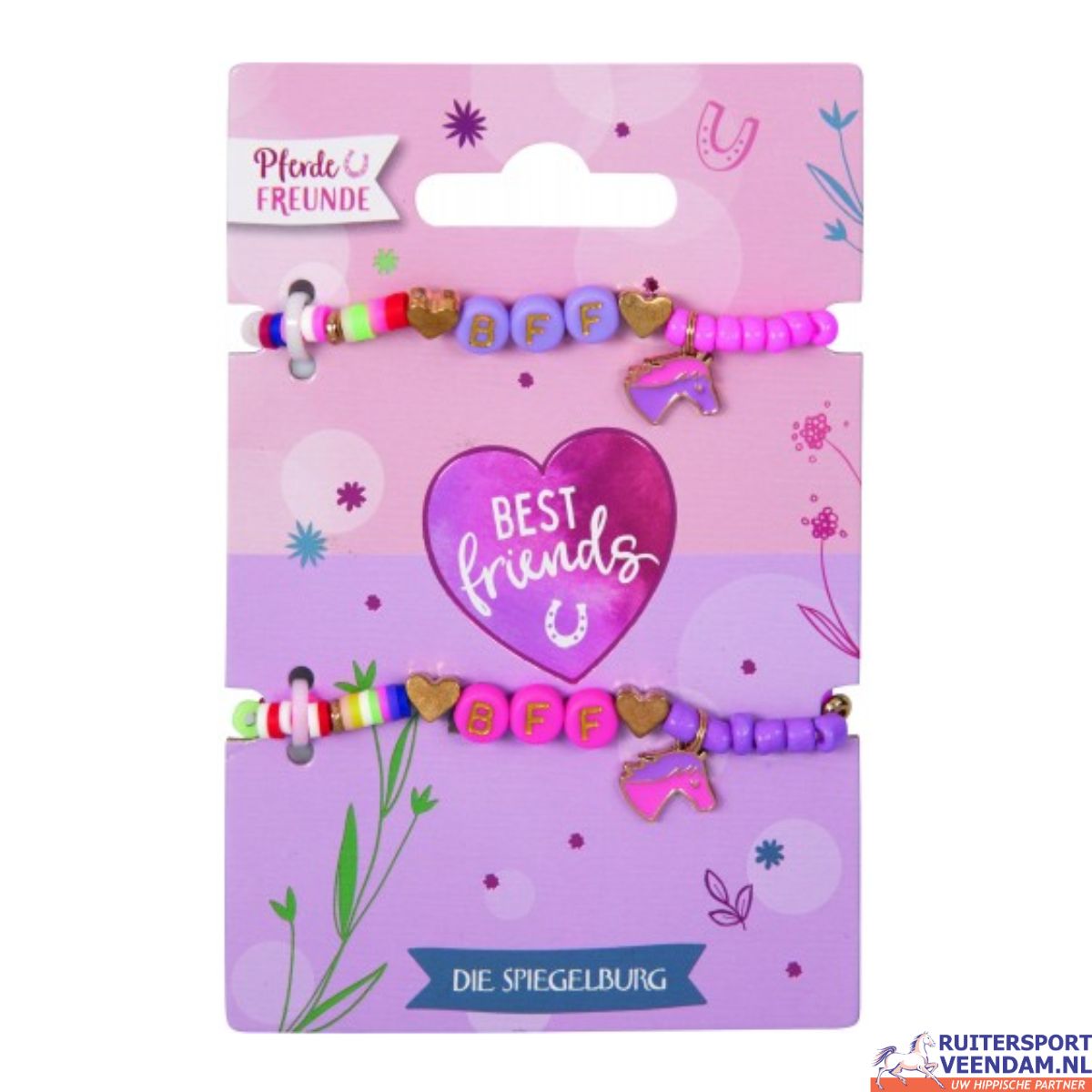 Deze betoverende vriendschap armbandjes zijn een must-have voor echte paardenliefhebbers en hun beste vrienden. In de set zitten twee elastische armbandjes, versierd met kleurrijke kunststof kralen en een schattige metalen paardenhanger.