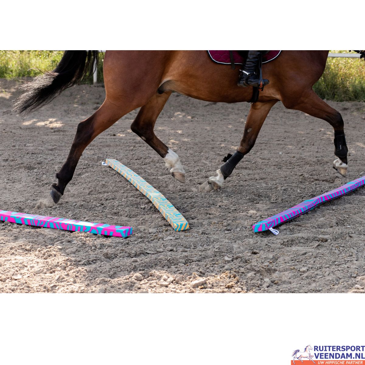 Het platte profiel (10 × 5 cm) voorkomt wegrollen, waardoor de balk stabiel blijft liggen en het vertrouwen van het paard wordt vergroot. De zachte foamconstructie vermindert het risico op blessures en maakt de balk geschikt voor dagelijks gebruik, zowel binnen als buiten.