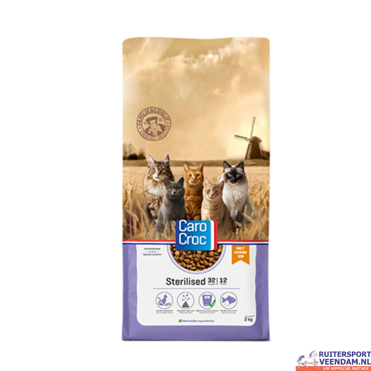 CaroCroc Sterilised is speciaal ontwikkeld voor gecastreerde en gesteriliseerde katten. Na sterilisatie of castratie neemt de energiebehoefte van een kat af doordat de stofwisseling verandert. De brokken hebben dan ook een lager eiwit- en vooral vetgehalte (32% eiwit en 12% vet) om in deze verlaagde energiebehoefte te voorzien en een gezond gewicht te ondersteunen.