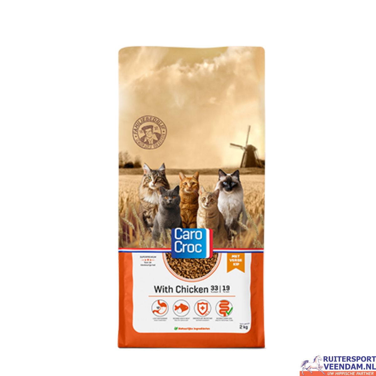 CaroCroc With Chicken is een volledig voer met verse kip voor volwassen katten jonger dan 8 jaar. CaroCroc With Chicken bevat een hoog aandeel gevogelte (38%), is zeer smakelijk en licht verteerbaar. De brokken bevatten prebiotica, dat draagt bij aan gezonde darmen voor jouw viervoeter. Het bevat alle voedingsstoffen die je volwassen kat nodig heeft.